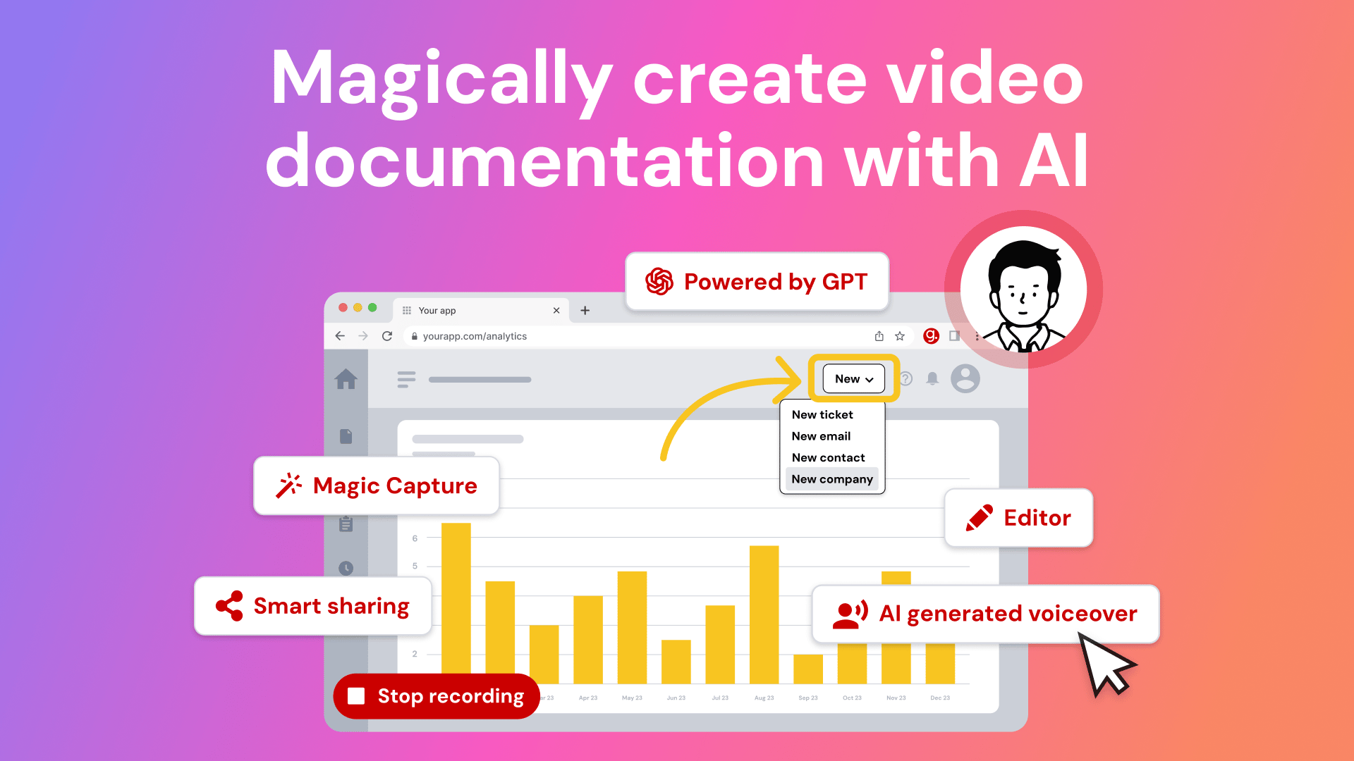 Simply click capture on the browser extension and the app will automatically generate step-by-step video guides complete with visuals, voiceover and call to action.